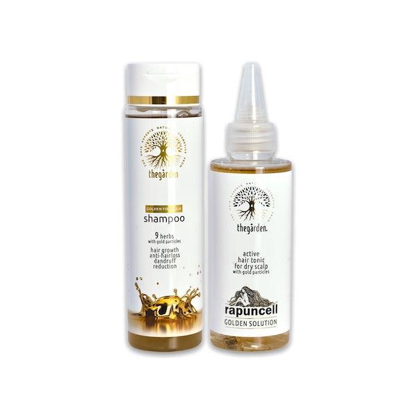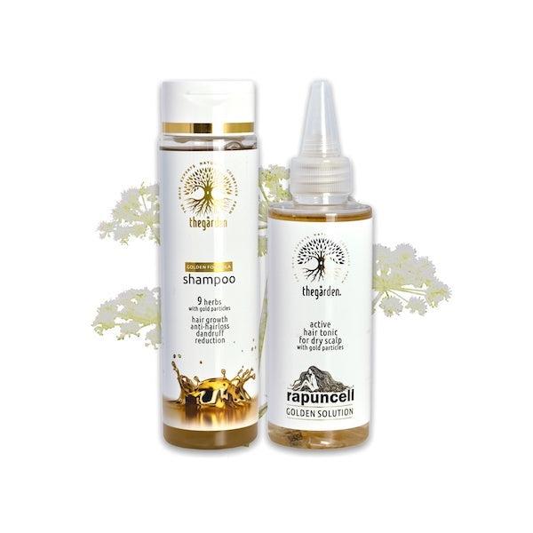 GOLDEN Basic Duo to funkcjonalne, nawilżające połączenie szamponu i toniku do włosów, które wspomaga wzrost włosów i hamuje nadmierne ich wypadanie. Przeznaczony do suchej lub swędzącej skóry głowy