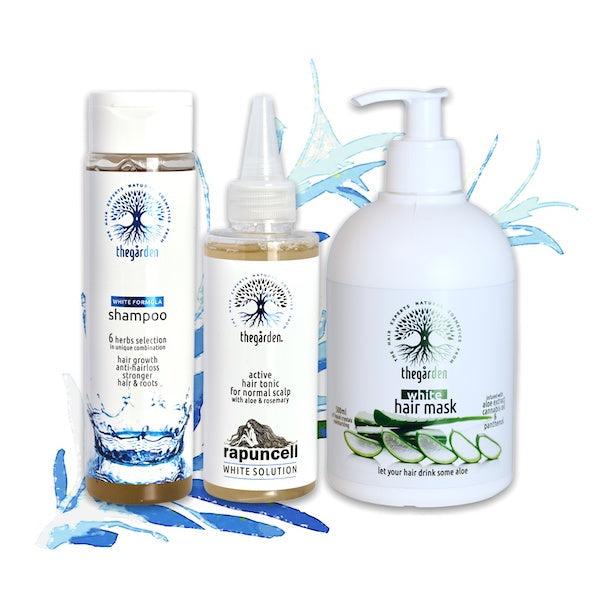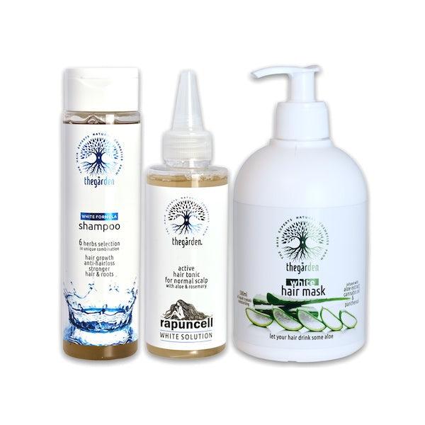 Promocyjny pakiet WHITE to funkcjonalne nawilżające trio szamponu, toniku i maski do włosów, które zaczynają szybciej rosnąć i przestają wypadać