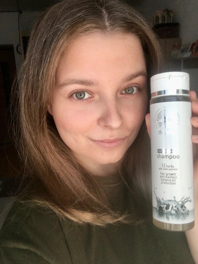 W szamponie pływają ekstrakty ziołowe i nano cząsteczki srebra koloidalnego, dzięki czemu można spodziewać się: